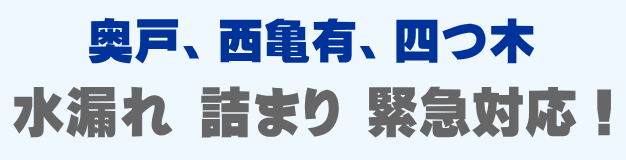 奥戸、西亀有、四つ木での水の困った即解決!急な水道トラブルに緊急でかけつけ訪問し、蛇口の水漏れ、トイレ詰まり、排水の溢れ、タンクの故障など修理いたします。